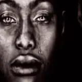 Mulher com cabelo azul e maquiagem, tocando o cabelo com a mão, com expressão de surpresa ou preocupação.