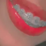 Dentes grandes e brancos com gengiva vermelha e preta, parecendo um sorriso assustador.
