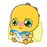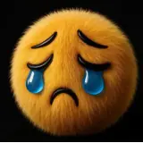 Rosto de gato amarelo com uma faixa rosa na cabeça e lágrimas azuis nos olhos.
